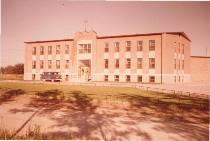 "Point is on the buildings of the Grandin College (administrative building, boy's residence, chapel and recreation) that were opened in 1964. These buildings are now part of the Paul W. Kaeser High School complex. The original Grandin College building opened in 1960 was located 60.006228 -111.890555. In 1964, this building became the girl's residence of Grandin College. This building was torn down after 1988" (Orlandini, 2019).Location Credit