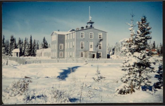 The Fort George Roman Catholic residential school (or the Ste. Therese de l’Enfant Jesus school) was established in 1937 on an island in the mouth of the Fort George (now the La Grande) River. Enrollment jumped to nearly eighty in the 1950s, and the school was overcrowded by the 1960s. In 1971 responsibility for the school (but not the residence, which was renamed the Couture Student Residence) was transferred to a provincial school board. By 1979 the residence had been transferred to a local school authority. (National Centre for Truth and Reconciliation)